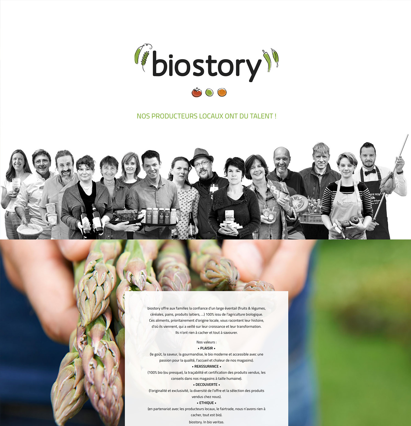 A website created to present "biostory" organic food stores. Biostory highlights regional organic producers and their organic products for sale in their local stores.