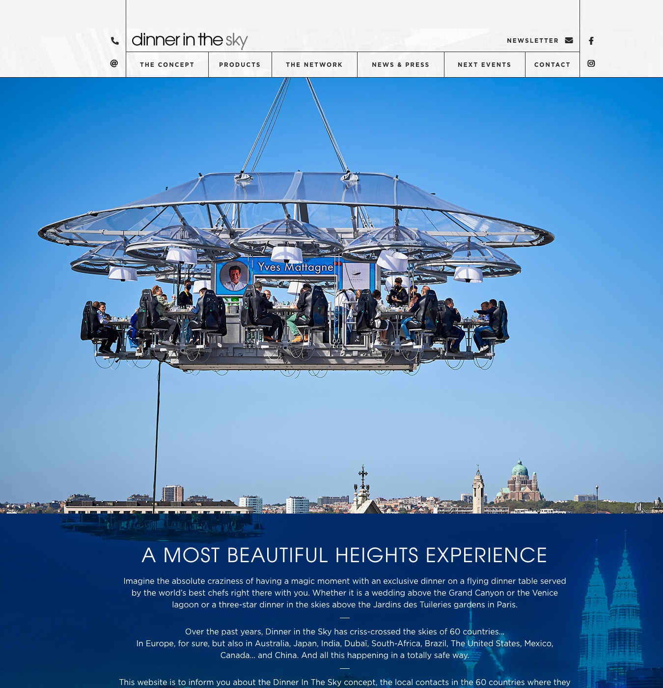 This is the international site "Dinner in the Sky" which aims to inform about their various event products and to gather and recruit all the contacts of the organizers of Dinner in the Sky events already present in more than 60 countries through the world.